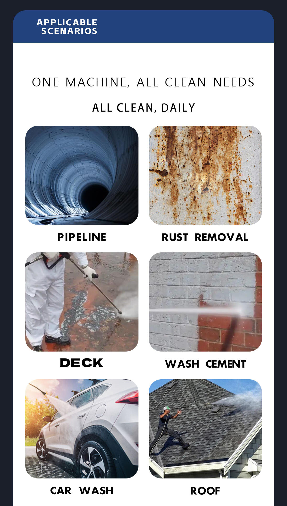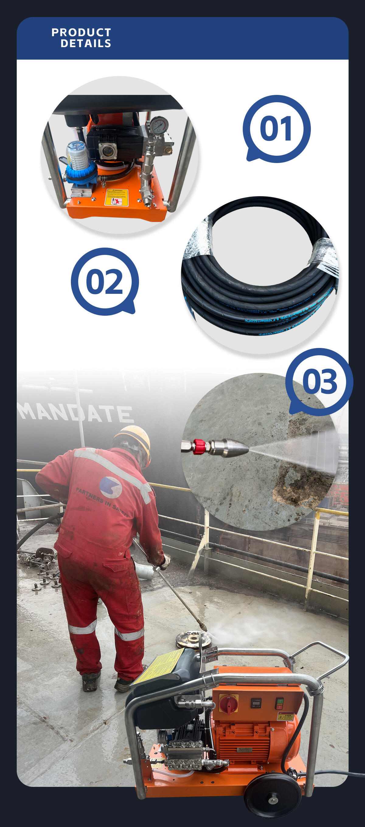A lavadora de alta presión WJ para cubertas de barcos e limpeza de edificios é unha ferramenta esencial para calquera profesional da limpeza ou entusiasta bricolaxe. O seu potente motor, as súas capacidades de alta presión e o seu deseño duradeiro convértena na solución perfecta para unha ampla gama de tarefas de limpeza. Diga adeus á suxeira e ao graxento obstinados coa lavadora de alta presión WJ: a súa ferramenta de confianza para a eliminación de ferruxe e desbarbado